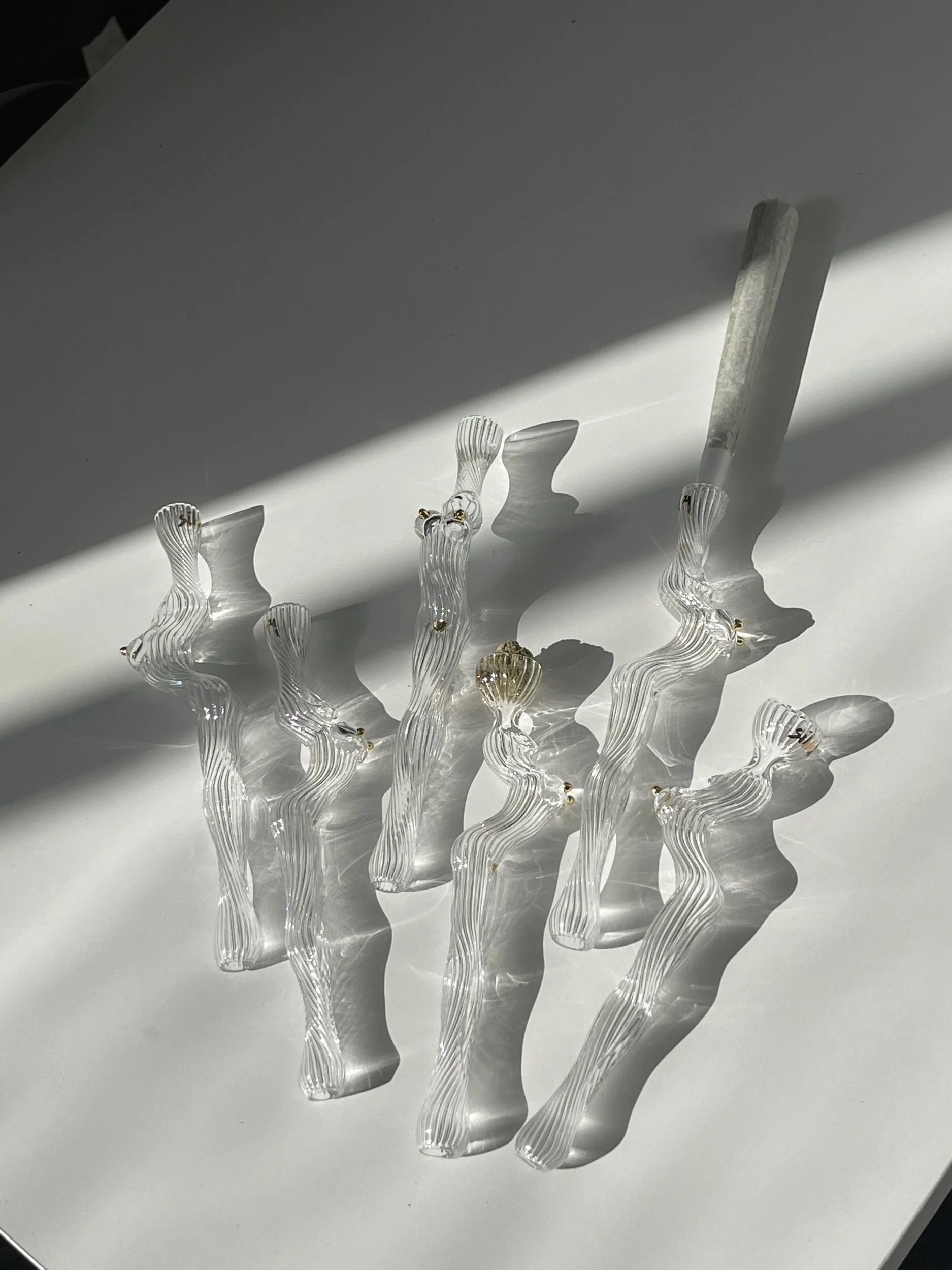 Little Lady J from $65.00 Lady Chillum from $65.00 Scalloped Lady J $85.00 Scalloped Lady Chillum $85.00 Dry Peak Torso $500.00 Sold out Modular Glass Bag $1,500.00 UV Proxy Dragon $650.00 Gold Fumed Pitcher $200.00 Black Cat J $90.00 Lupus Insecta $1,800.00